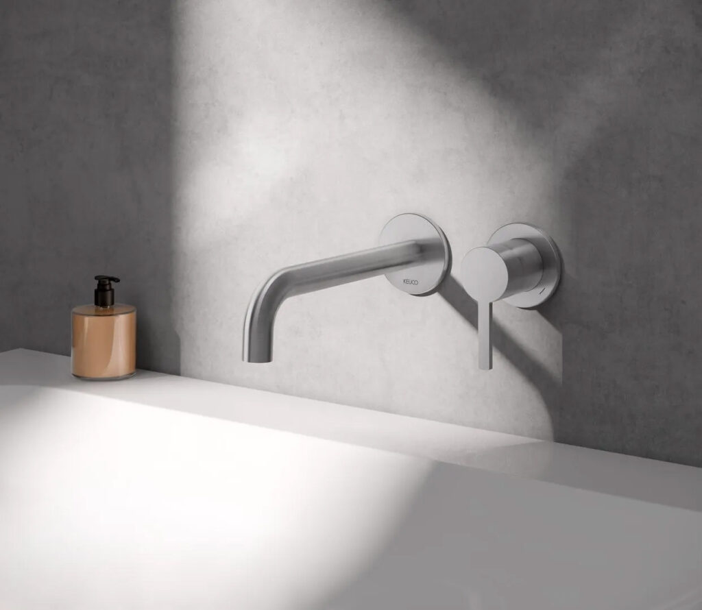 Die KEUCO Serie PLAN zeichnet sich durch das vielseitige und umfangreiche Sortiment aus.  Die PLAN blue Armaturen sind mit ihrem universellen Design in zahlreichen Badeinrichtungen einsetzbar und fügen sich in die stilsichere Raumarchitektur ein. Mit der PLAN blue Wandauslaufarmatur für den Waschtisch wird das Armaturen-Sortiment um eine designstarke Komponente erweitert. Aus massivem Edelstahl oder aus Messing mit Oberflächen in Chrom, Aluminium-finish und Schwarz matt sind die Gestaltungsmöglichkeiten, besonders in Kombination mit den vielen Accessoires der Serie PLAN, groß.